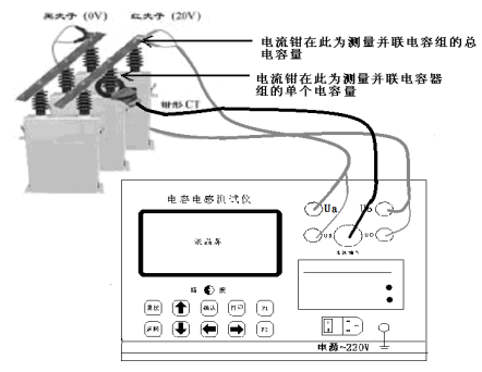 如果电容器组有多个单相电容需要测试,可以再测试完第一个电容值后按返回键,电压测试线不用动,直接将测试电流的电流钳打开然后夹到下一个电容上按确认键进行测试,这样可大大的提高测试速度,这才是本仪器的最大特色。