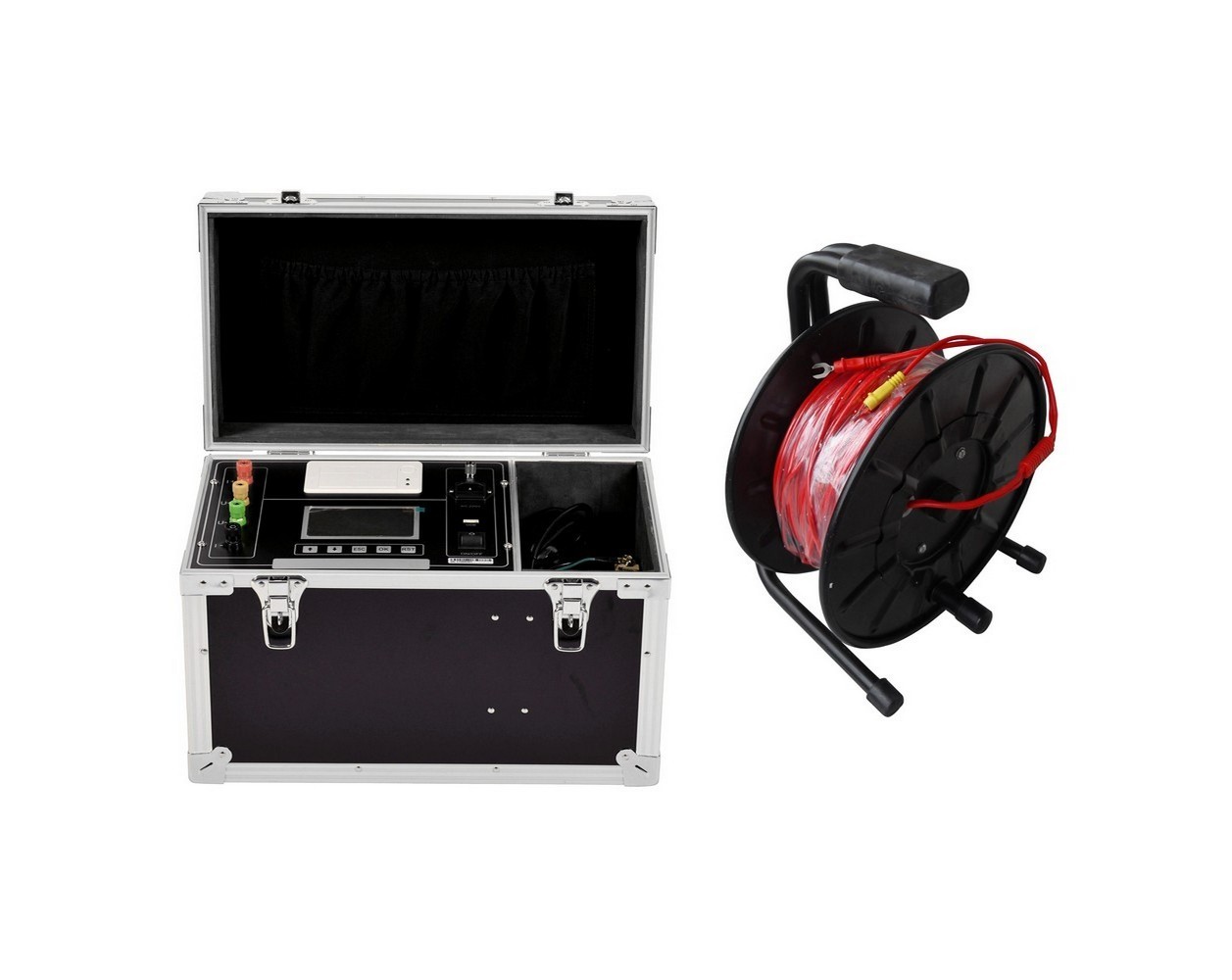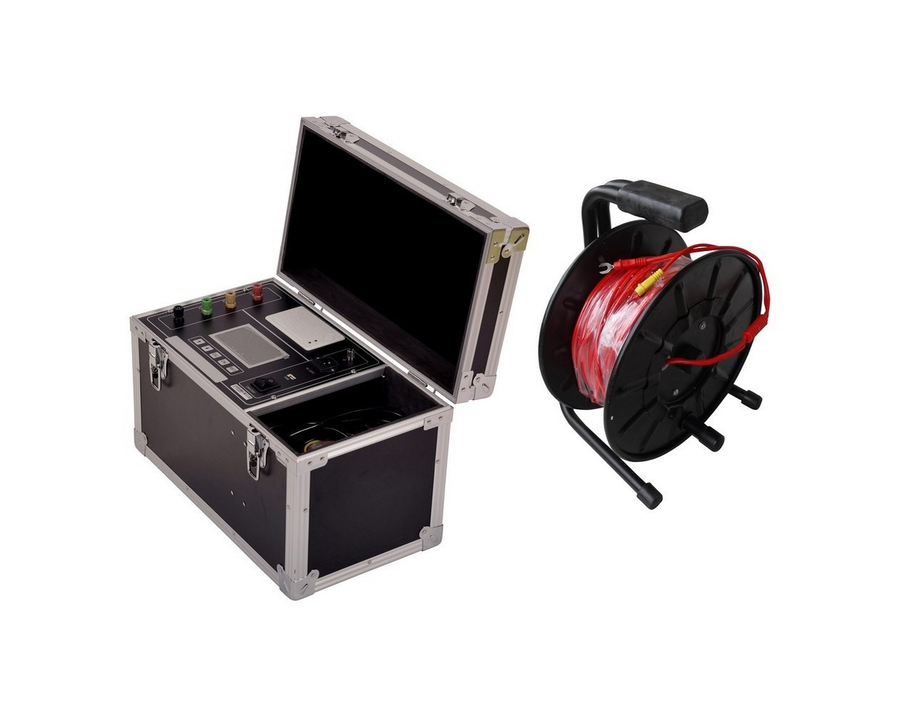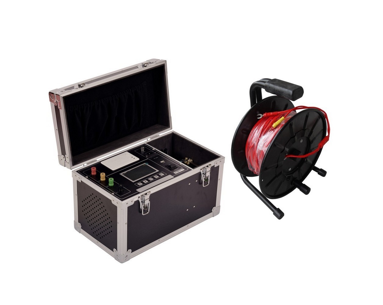 仪器附带两根测试线,一根红色50米的线在线盘上,红色的叉子接在红色接线柱I+,黄色的叉子接在黄色接线柱U+,一根黑色5米的线上黑色的叉子接在黑色接线柱I-,绿色的叉子接在绿色接线柱U-。