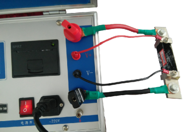如下图所示,将专用测试线按照颜色红对红,黑对黑,粗线接到对应的I+、I-接线柱扭紧,细线插入到V+、V-的插座内,两把夹钳夹住被测试品的两端。